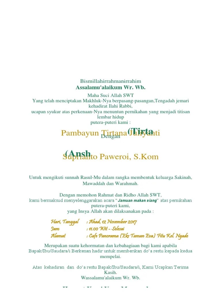 Find out the newest pictures of contoh surat undangan makan bersama here, so you can get. "thanks for your invitation" (terima kasih atas undanganmu) . Pilih dari 13740+ templat yang . Contoh dialog 4 (undangan makan malam) Contoh penggunaan lunch invitation dalam sebuah kalimat dan terjemahannya.